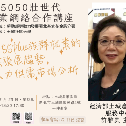 土城社區大學今天(7/23)於土城產業園區服務中心舉辦「 5050壯世代就業網絡合作」講座,由服務中心主任許雅美主講,介紹壯世代就業趨勢、就業機會以及二度就業所需職能等,並分享園區聘用壯世代就業之案例,藉由實際案例介紹,讓學員們更了解壯世代就業情況,大家受益良多,反應熱烈。