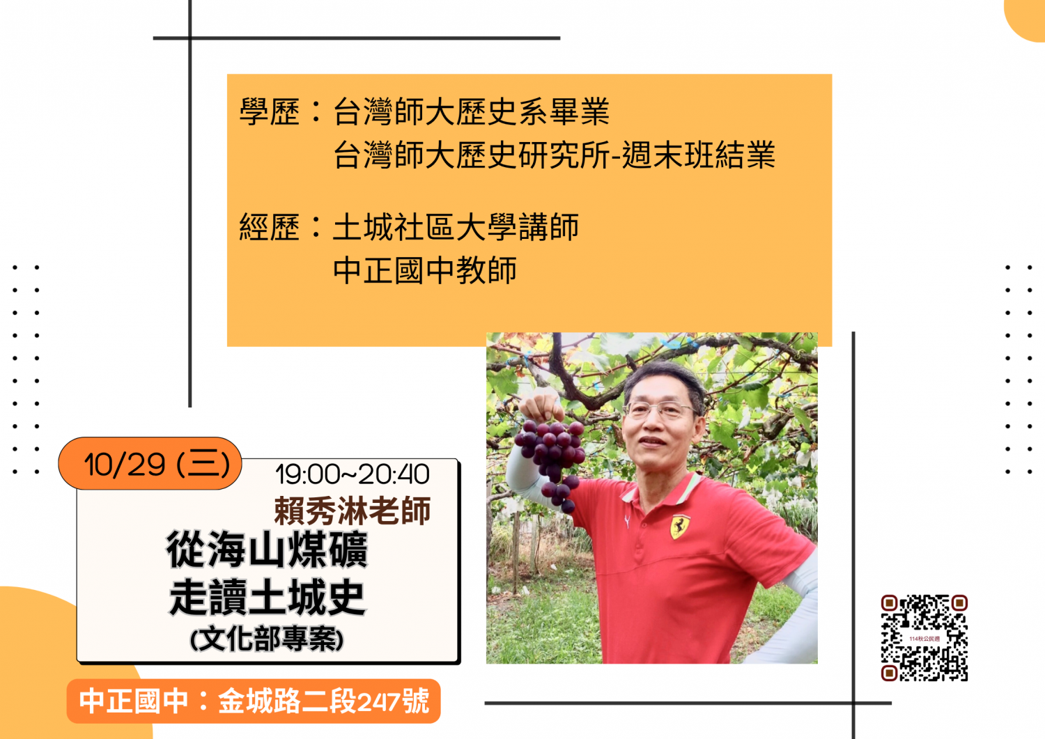 10/25(六)至10/31(五)為本校114年秋季班公民週,聘請專業師資,特別精心規劃七場次講座(活動),可連結下列網址